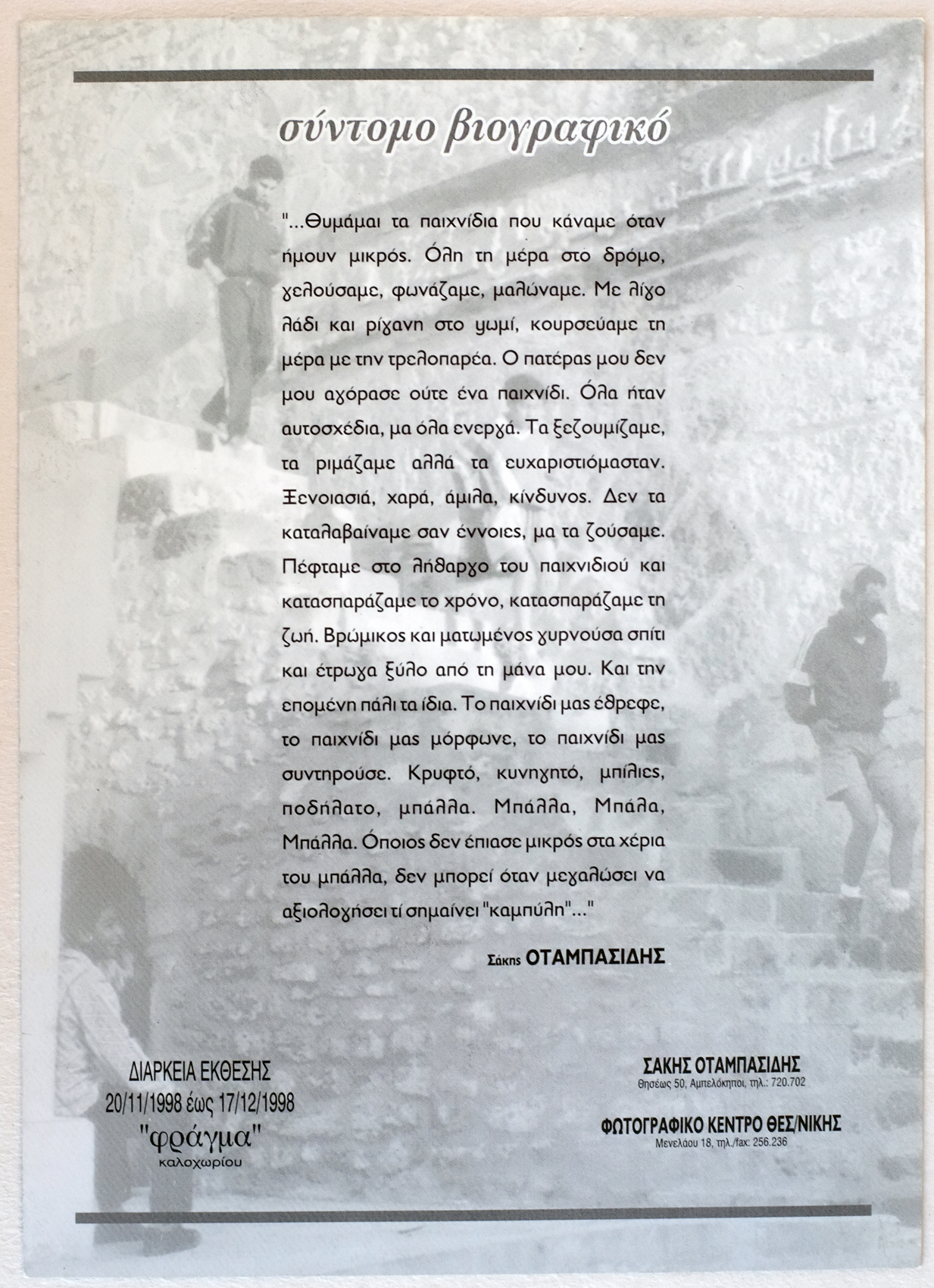 20/11-17/12 Eκθεση του Σάκη Oταμπασίδη με τίτλο: "Παί-ζειν". Στο ουζερί "Tο φράγμα" στο Kαλοχώρι.
